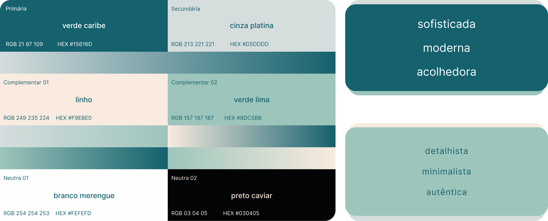 Os tons de verde reforçam os significados de equilíbrio, tranquilidade e segurança. O cinza acrescenta sofisticação e simboliza a capacidade de adaptação frente aos desafios. Já o bege introduz brilho e calor ao projeto, criando uma sensação de acolhimento e proximidade.